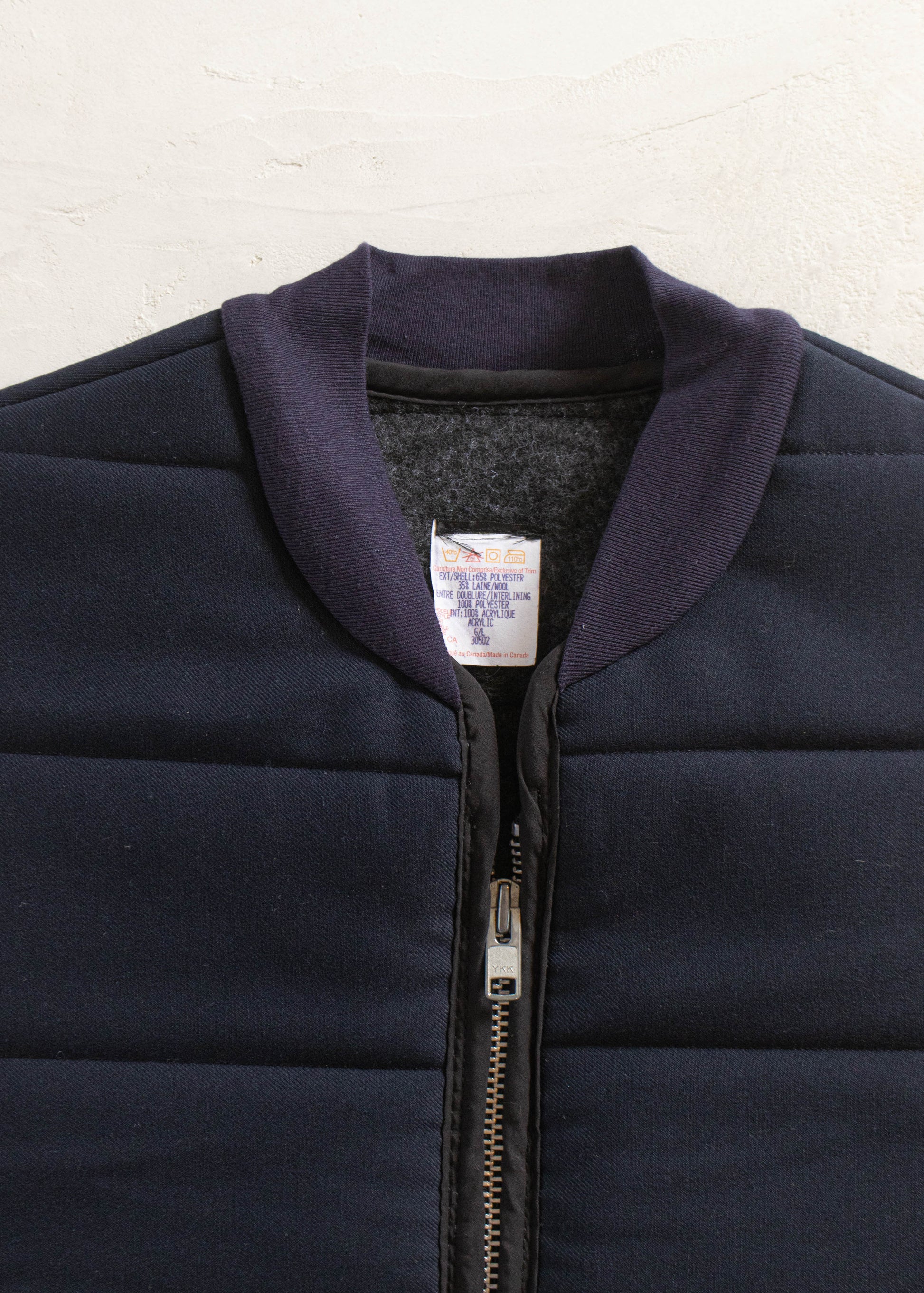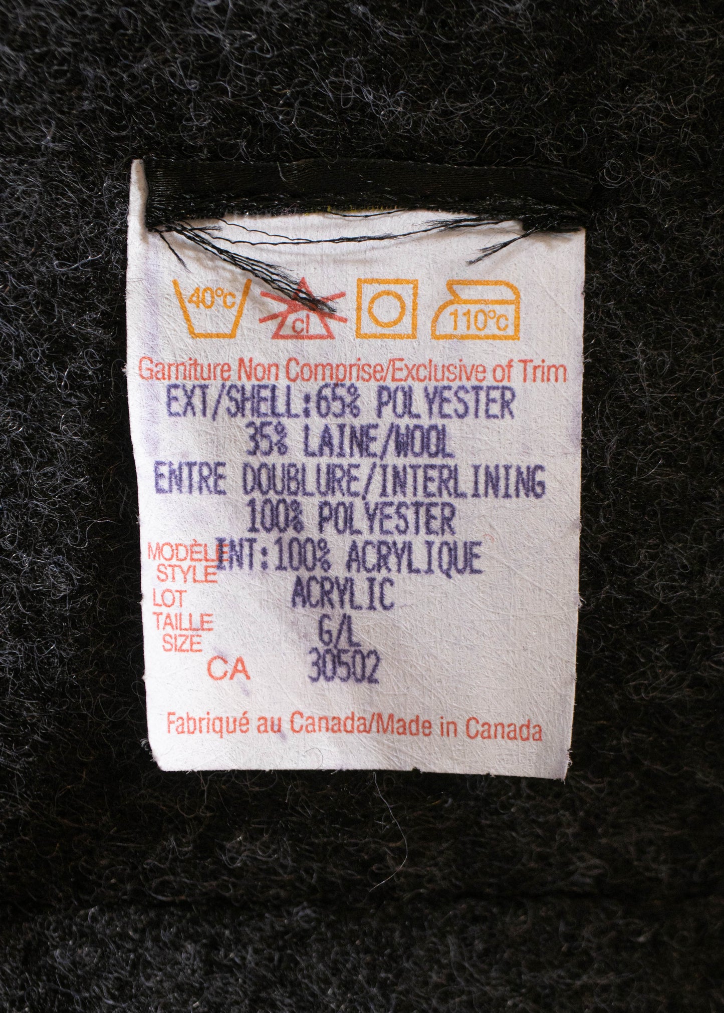 Shell 65% Polyester / 35% Wool / Lining 100% Polyester / Interior 100% Acrylic. Made in Canada