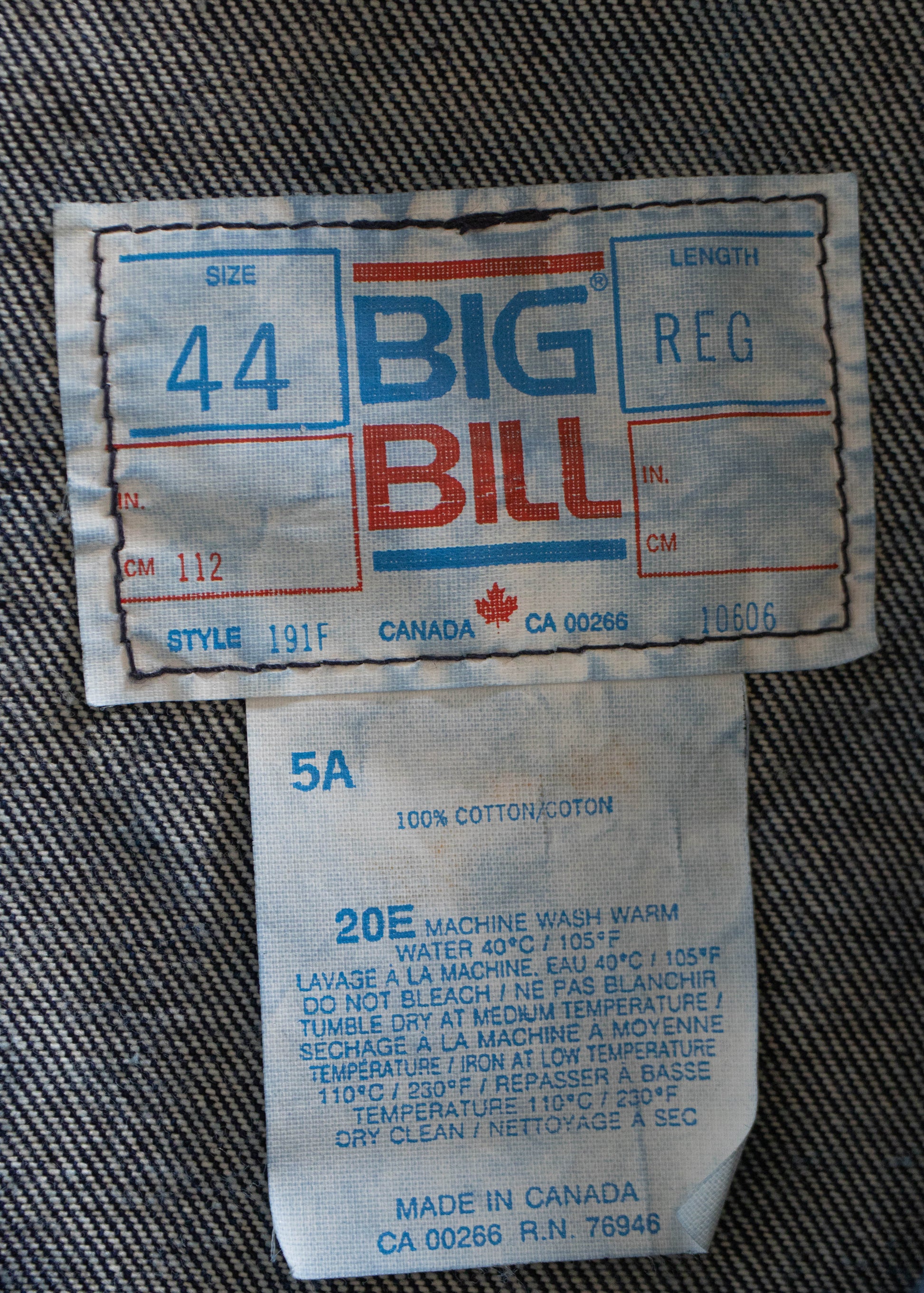 100% Cotton. Made in Canada. Big Bill brand.