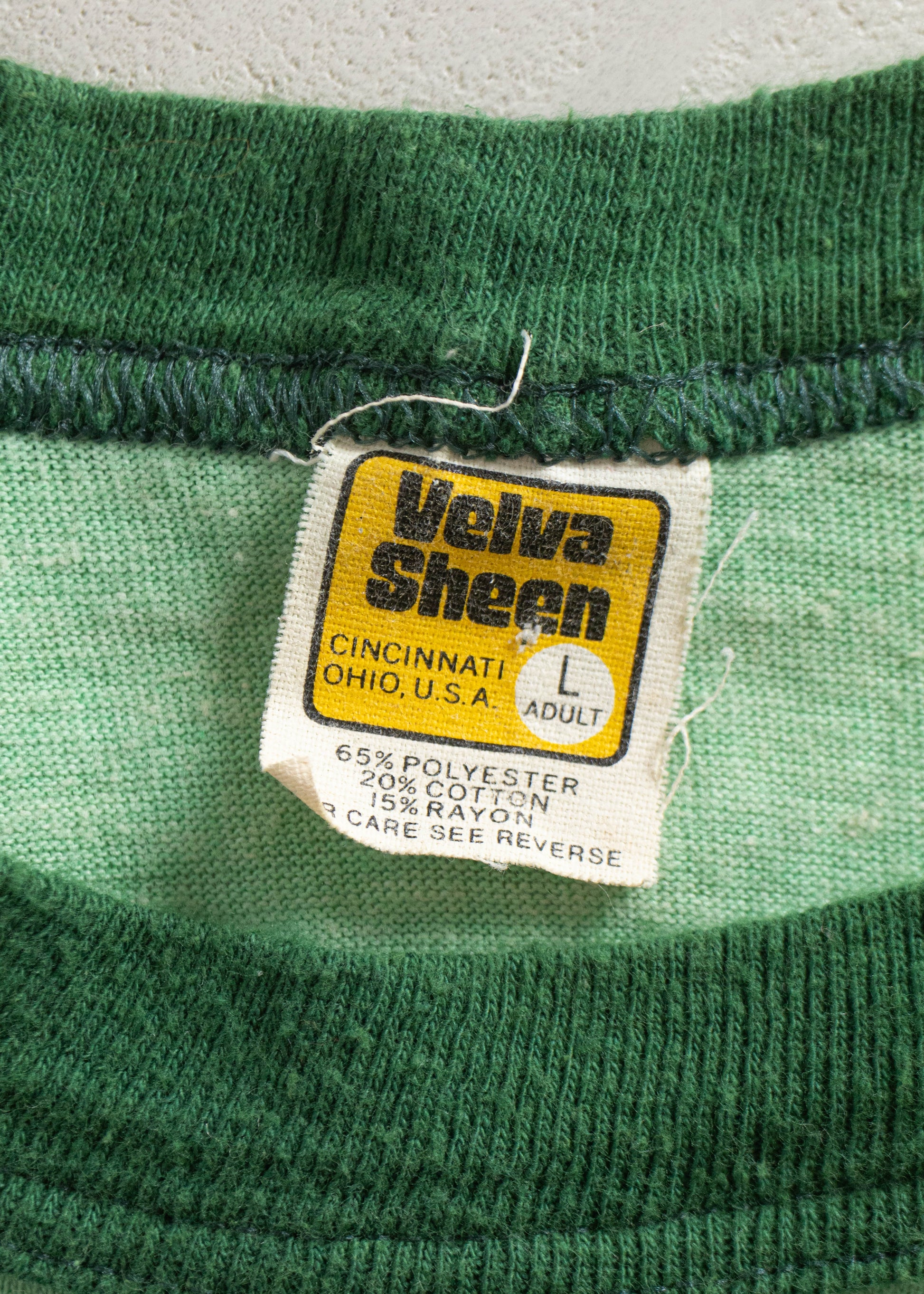 65% Polyester / 20% Cotton / 15% Rayon. Made in USA. Velva Sheen Brand.