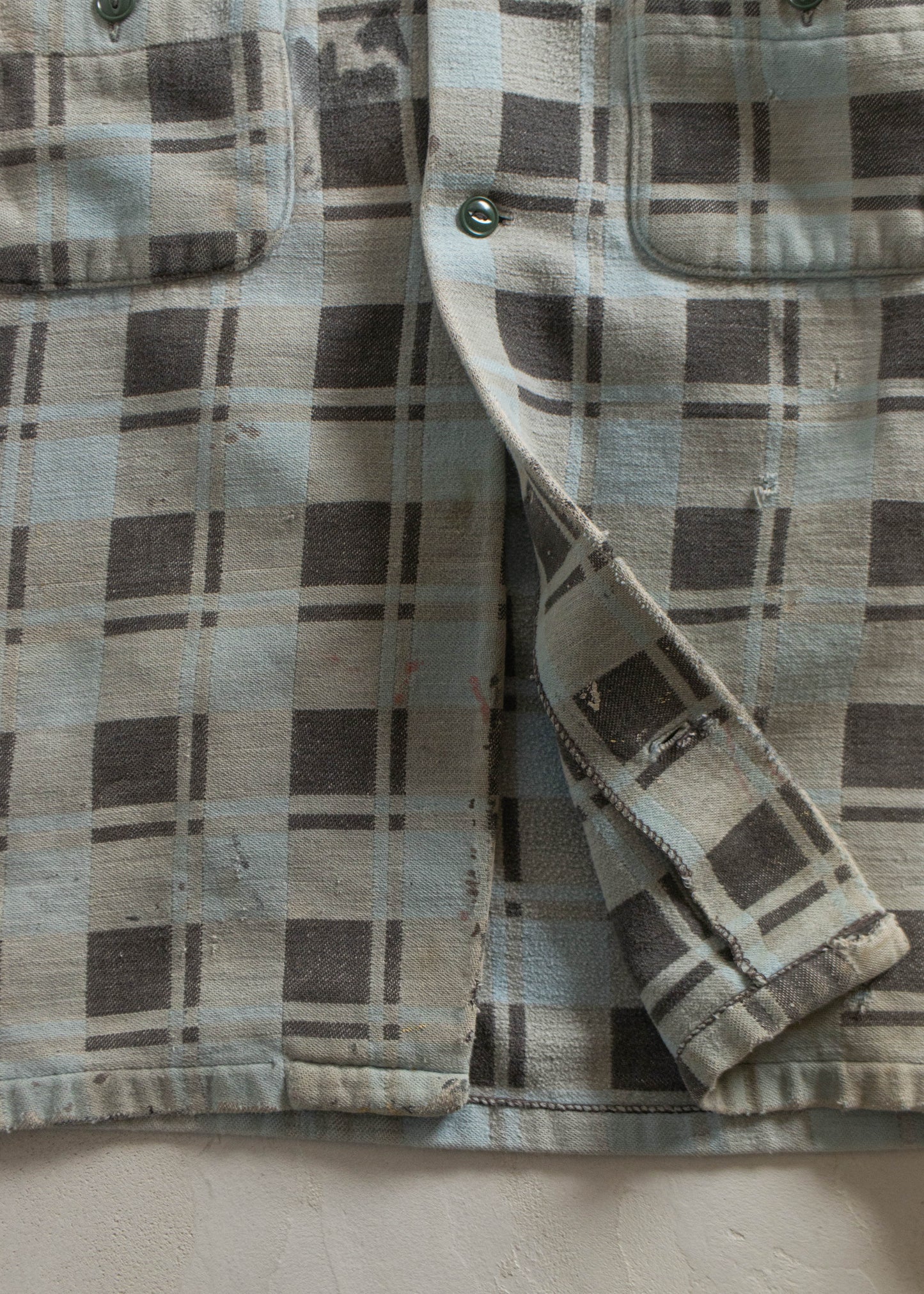 Very worn vintage condition. Faded, rips and tears, stains, holes, button missing Wear as pictured. This item is vintage and shows signs of previous wear.