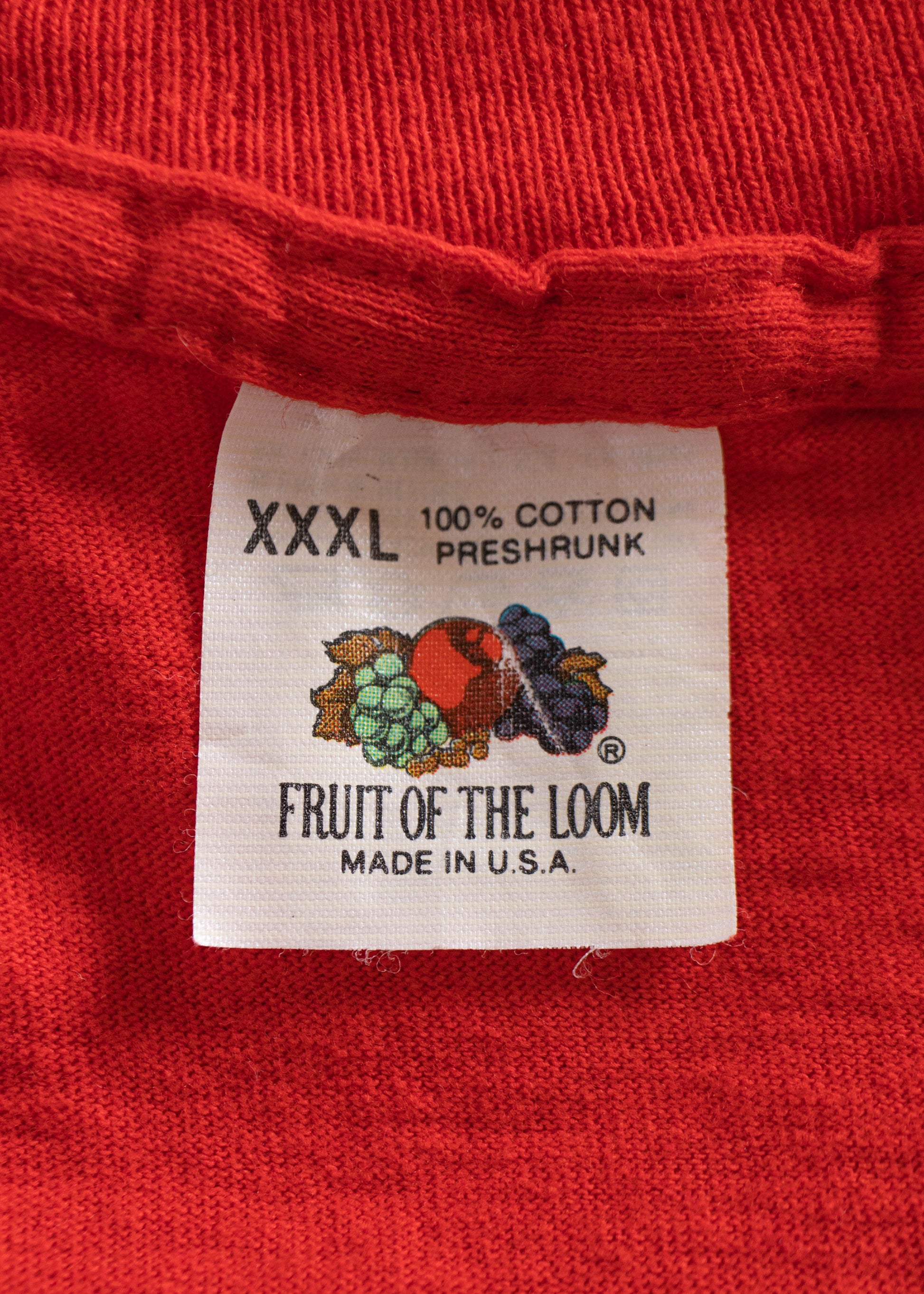 100% Cotton. Single Stitch. Made in USA. Fruit of the Loom brand.