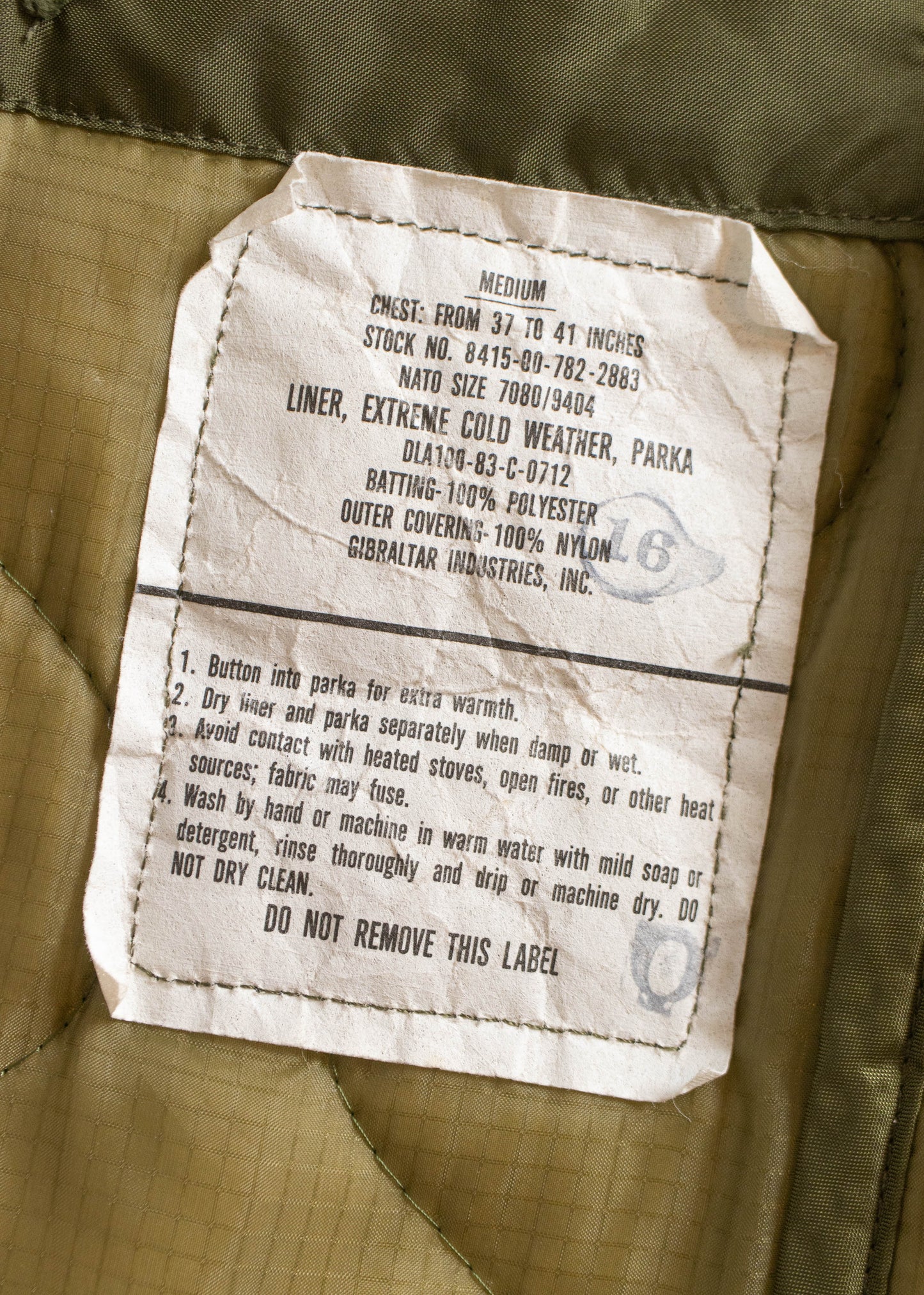 Shell 100% Nylon. Lining 100% Polyester. Made in USA. Military Issue.