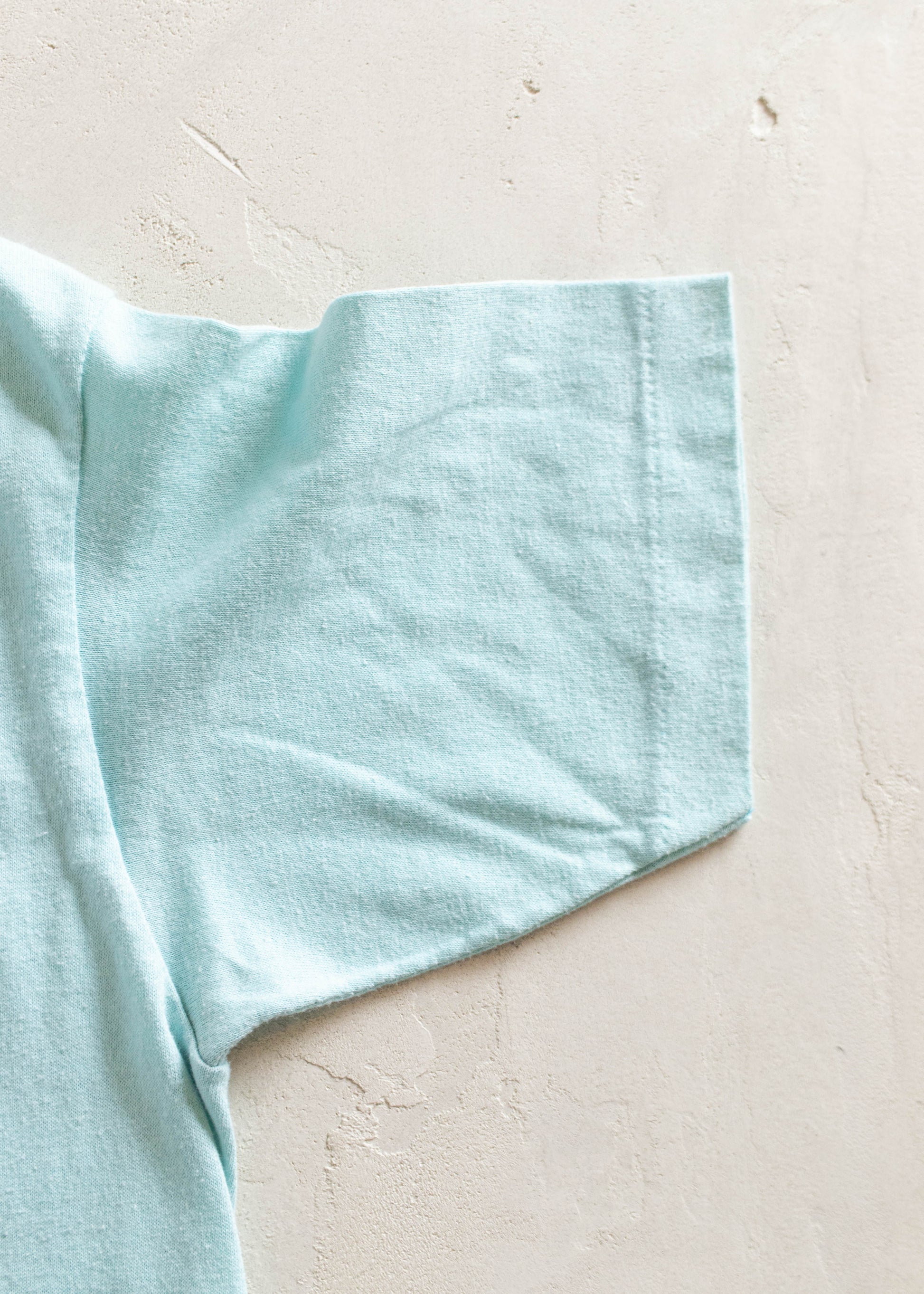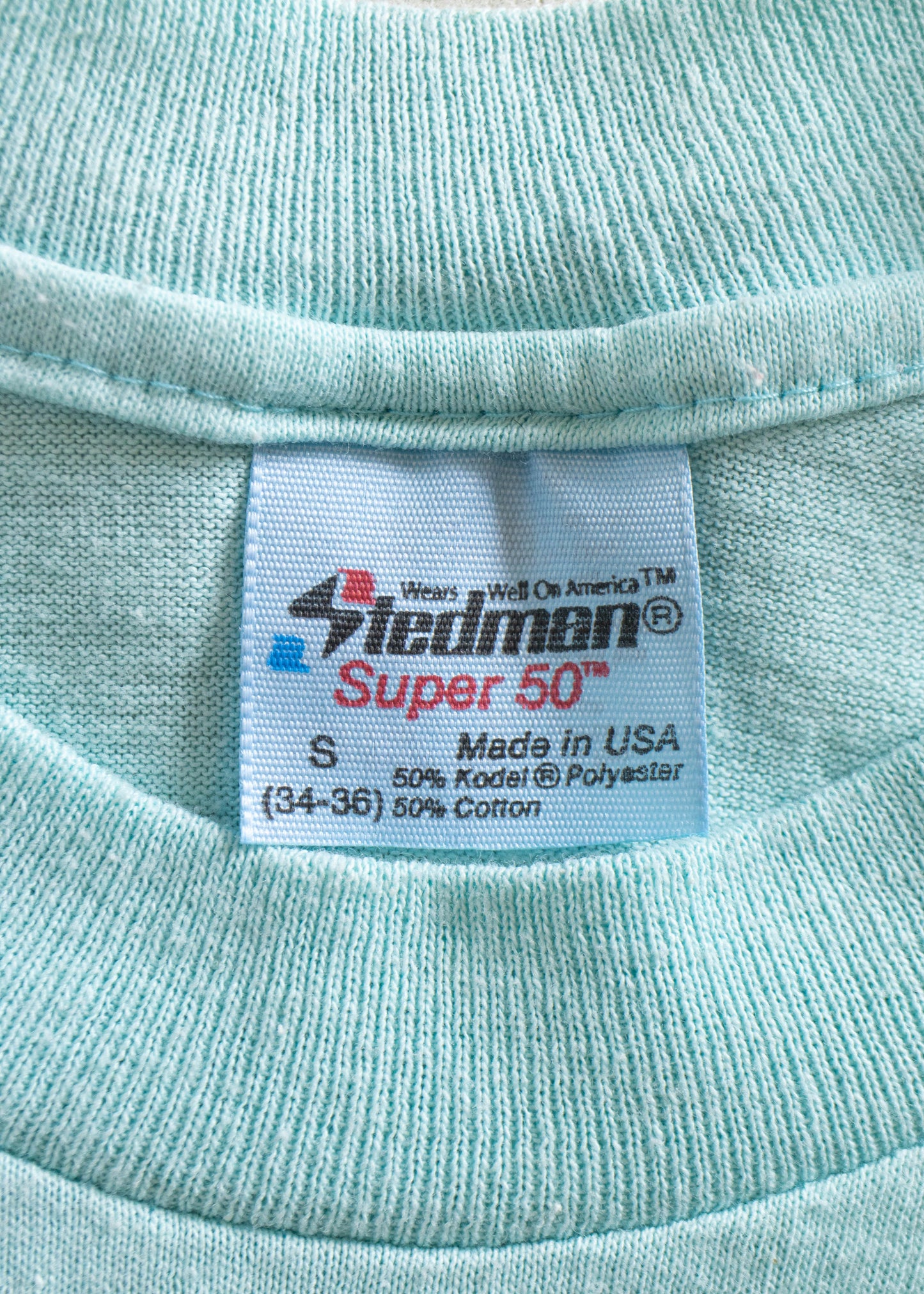50% Cotton / 50% Polyester. Single Stitch. Made in USA. Stedman brand.