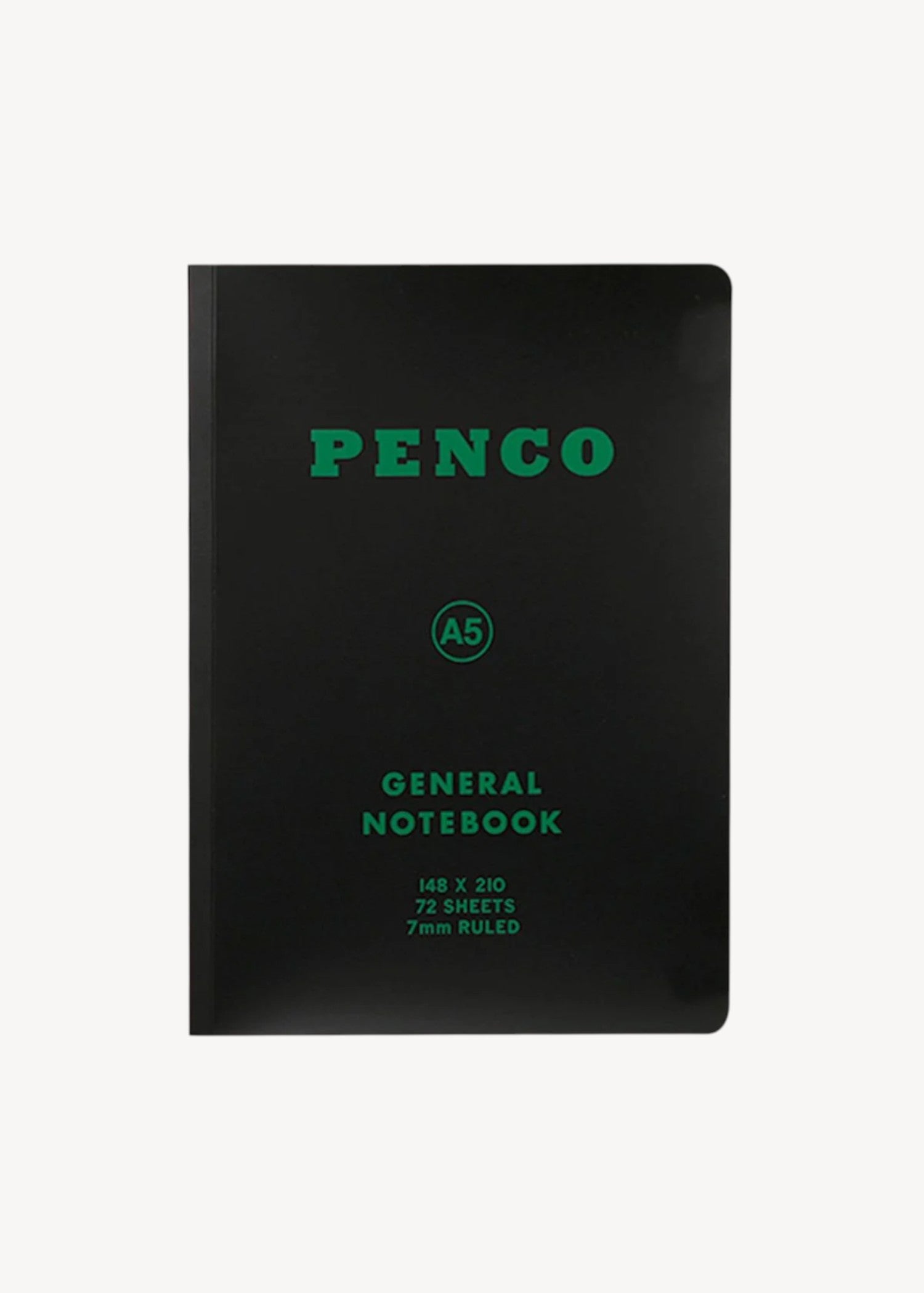 A lined notebook with a flexible plastic cover by Penco. 140 pages. 7mm ruled.