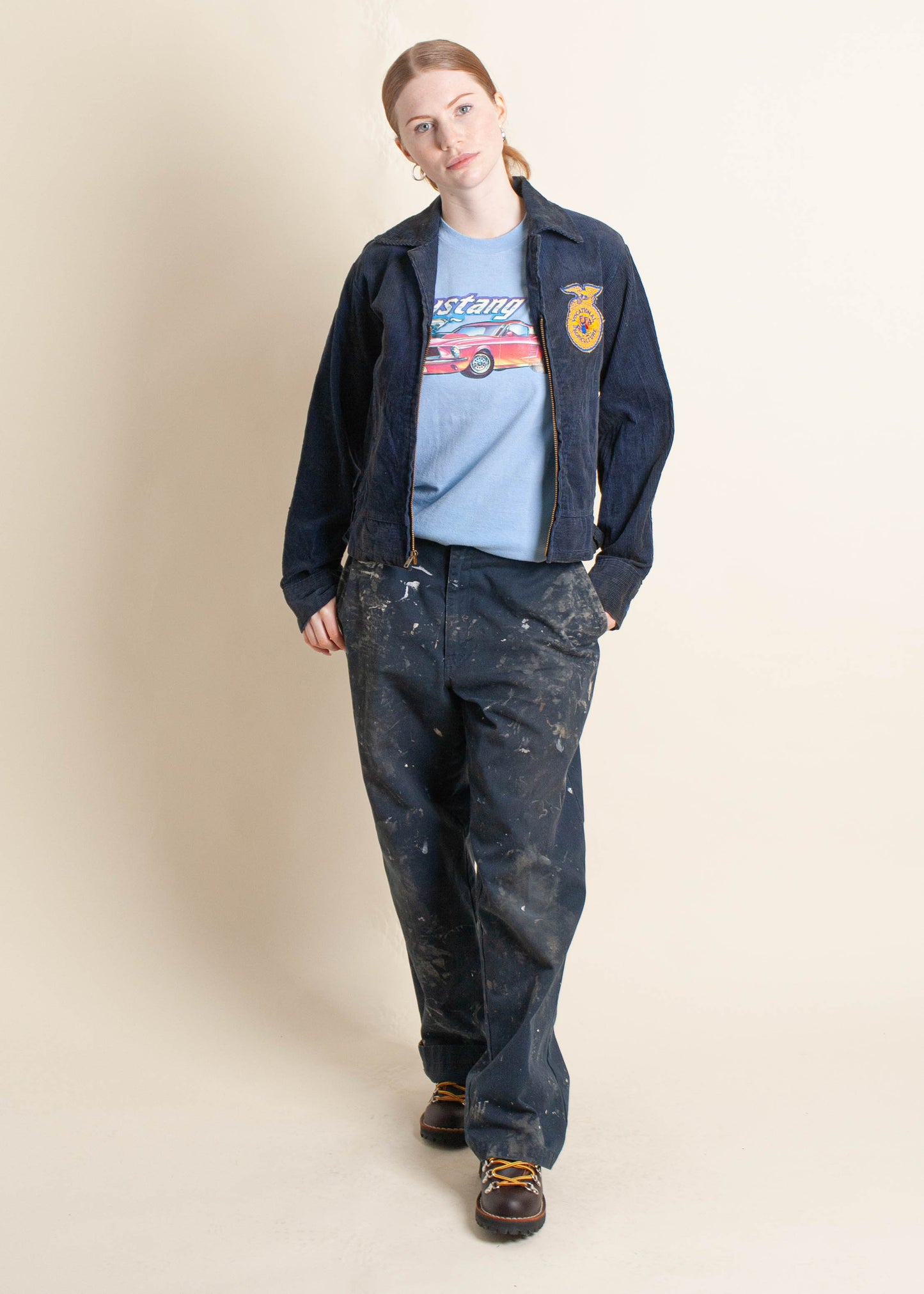 In worn vintage condition with signs of discoloration throughout, staining on front and both sleeves. Zipper closure, 85% cotton / 15% Polyester.